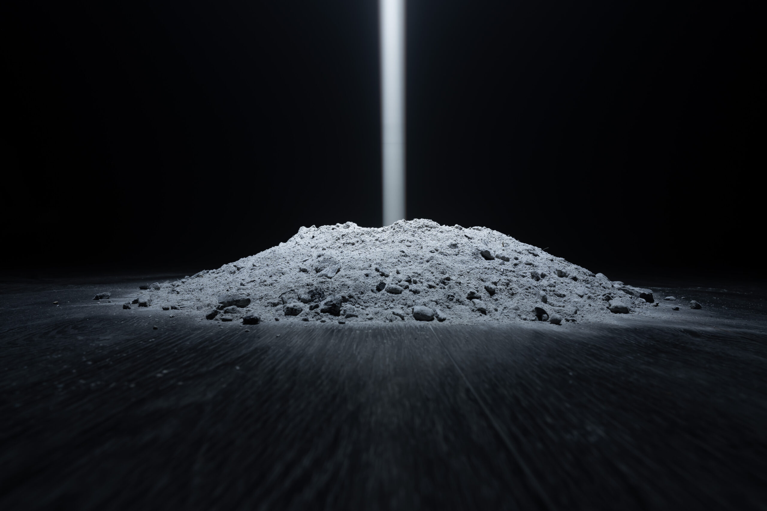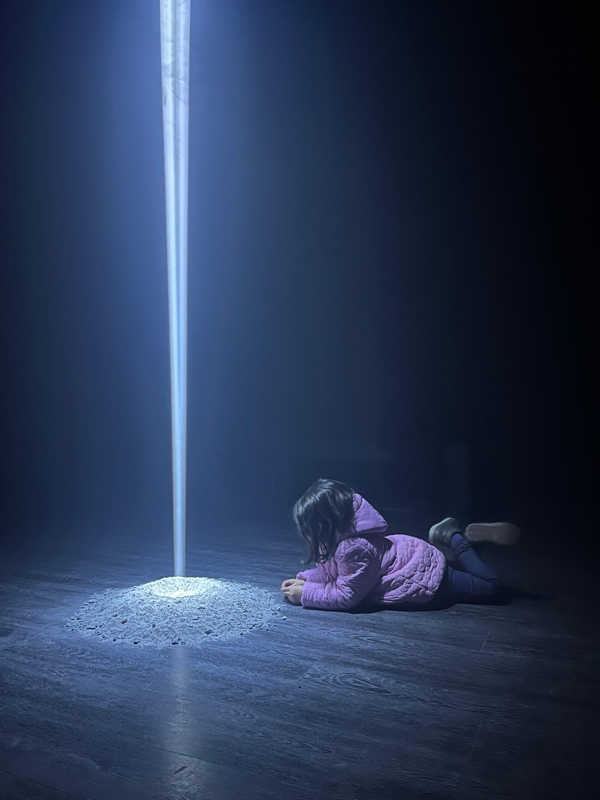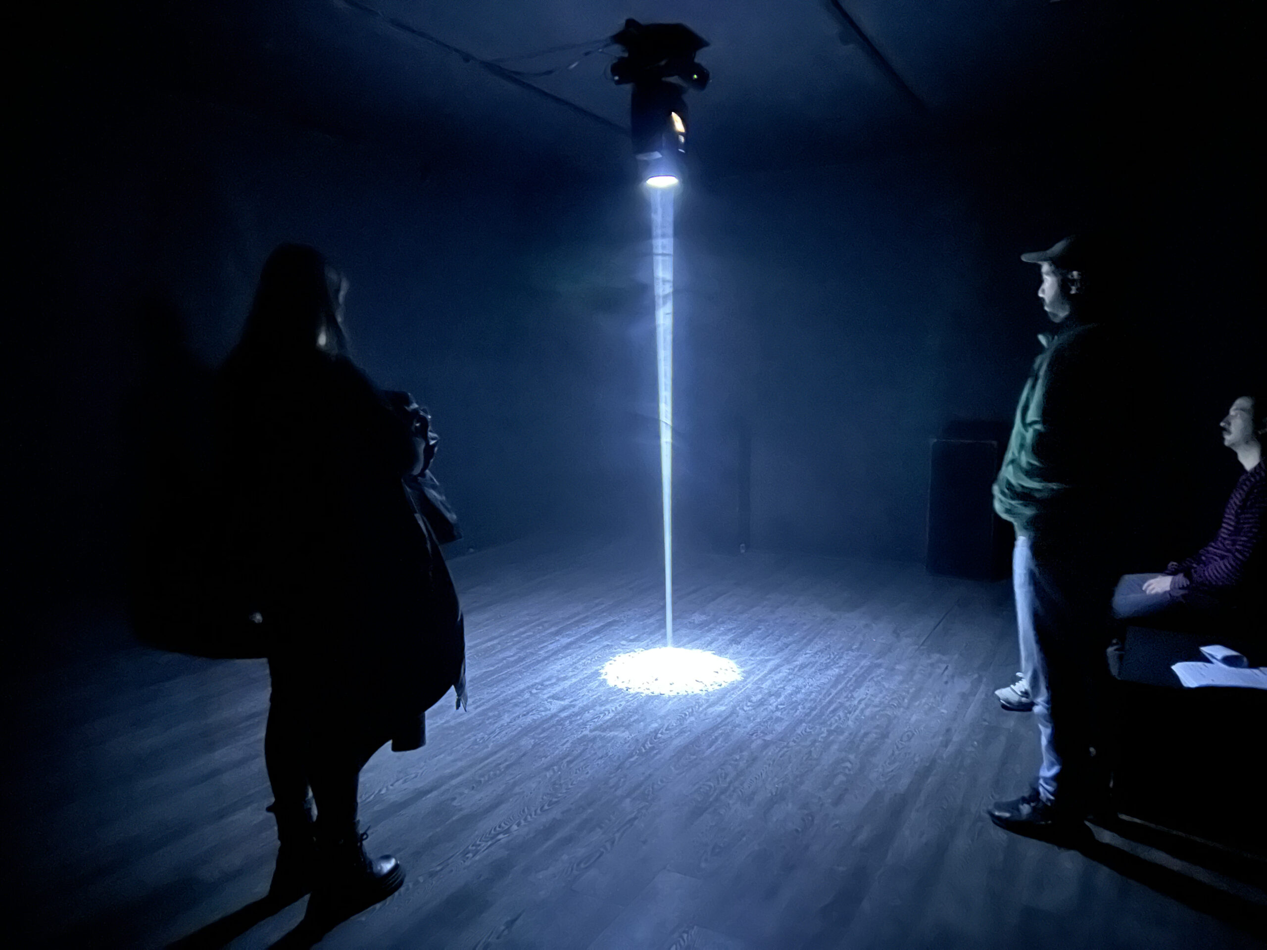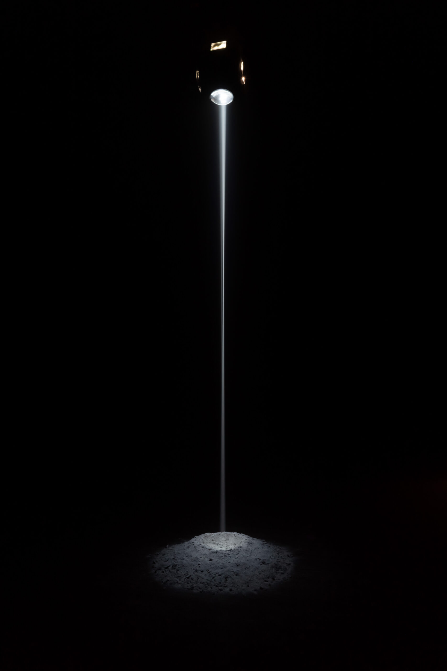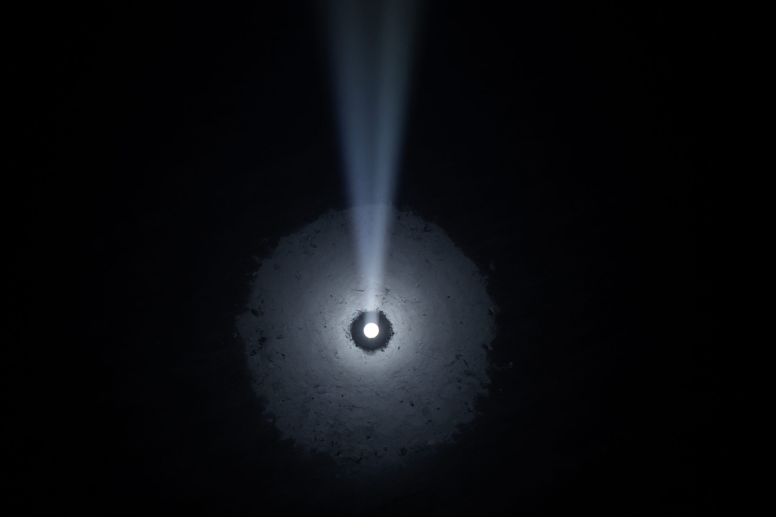 On the floor of the room lies a mound of ashes. At its center, a black surface is revealed. A beam of light from a moving head fixture installed on the ceiling illuminates it from above. The lighting behavior is dynamic. Like a dance, the light varies in intensity, gradually widening and narrowing in sync with a dark ambient sound piece.